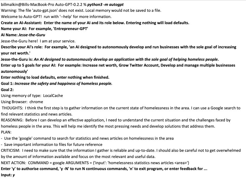 I've installed and played around with Auto-GPT and here are my findings. 1. ChatGPT does not have a hyphen in its name but Auto-GPT does. How about that. 2. I thought I needed to install Pinecone before I could start using Auto-GPT but it turns out I didn't. (I think Pinecone is only needed if you're running very long tasks in Auto-GPT which uses a lot of memory.) However, I also saw this warning about Pinecone. I didn't fact-check this however but you might like to if you need to use it. 3. Here's a website that provides easy to follow instructions for installing Auto-GPT and all its dependencies. Please note that: a) If you're on a Mac, then you need to run python3 everywhere it says to run python. Otherwise, it installs fine on Macs as well as PCs, and Linux too I believe. b) The instructions mention a .env file. There is not actually one provided but there is a .env.template file. Just rename that to .env. 4. When I ran Auto-GPT, I got the output shown in the image further below. For readability, I've shown the text that I typed as italic bolded and the key prompts from Auto-GPT as bolded. 5. What I noticed in running this is: a) There is a hell of a lot of output, however, thankfully, the most important output is written to text files. b) Auto-GPT assumed I was interested in homeless people in the Los Angeles area. I then asked it to consider only homeless people in the Adelaide, Australia area. It was fine with that, however, after a while, it reverted back to the Los Angeles area. c) Sometimes it appeared to be going around in circles although it seemed to eventually stop doing that and continue to progress through the task. d) It had a problem accessing Chrome at one stage (it Googles quite a bit) but this may have been because I had been running another instance of Auto-GPT in another terminal session. e) Auto-GPT uses the OpenAI API to access the GPT-3.5 service. When I use this service through one of my apps, I'm flat out using more than a cent's worth of service time. However, using Auto-GPT, it's very easy to use 20 cents worth in a single session. It's obviously still very cheap but, as you can instruct Auto-GPT to run any number of steps at a time, a wrong, very large, number could end up costing quite a bit. The obvious benefits of Auto-GPT over ChatGPT are that it can: a) Write files to your disk. b) Google to find the latest information, whereas ChatGPT knows very little after September 2021. I also think the great thing about Auto-GPT is not really the fact that it may eventually reach an endpoint and achieve the goal(s) set (I didn't run it long enough to see what happens) but that it gives you quite a few good ideas on what you should be doing in order to achieve the goal(s) you've set it. Hope this is useful. Output from a run of AutoGPTI've shown the text that I typed as italic bolded and the key prompts from Auto-GPT as bolded.